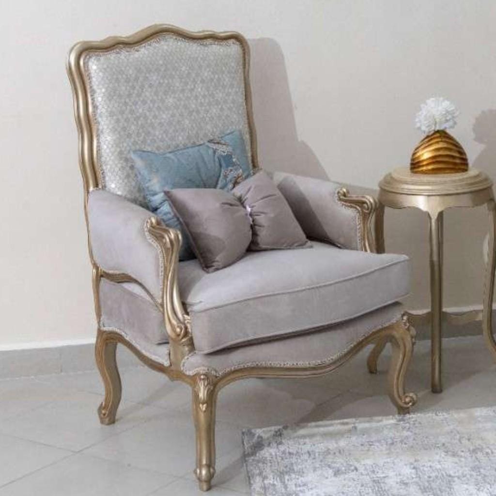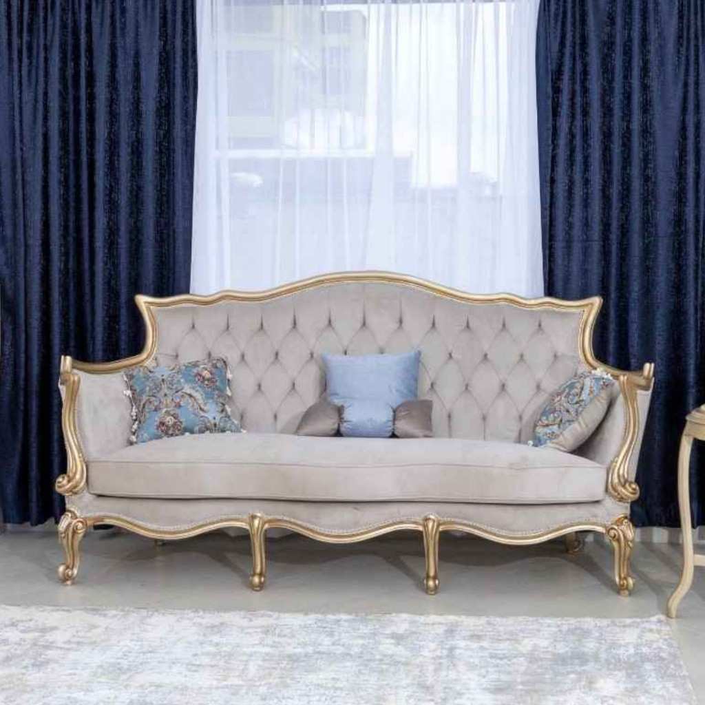 The Lunaria Gold Set is a luxurious 7-seater living room ensemble designed to elevate any space with regal charm. It includes a central sofa, two armchairs, and two side chairs, all upholstered in light-toned fabric with elegant gold trim and ornate detailing.